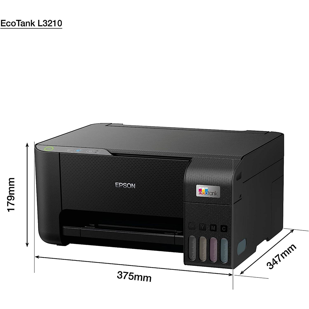 Epson EcoTank L3210 A4 All-in-One Ink Tank Printer, 5760 x 1440 dpi Resolution, Print/Scan/Copy, Up to 33.0 ppm Print Speed, 180 x 1 Nozzles, Spill Free, Error Free Refilling, USB, Black
