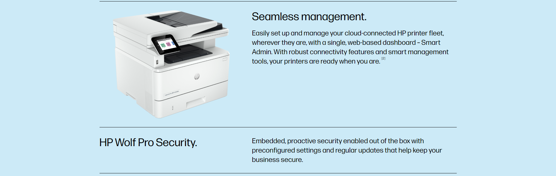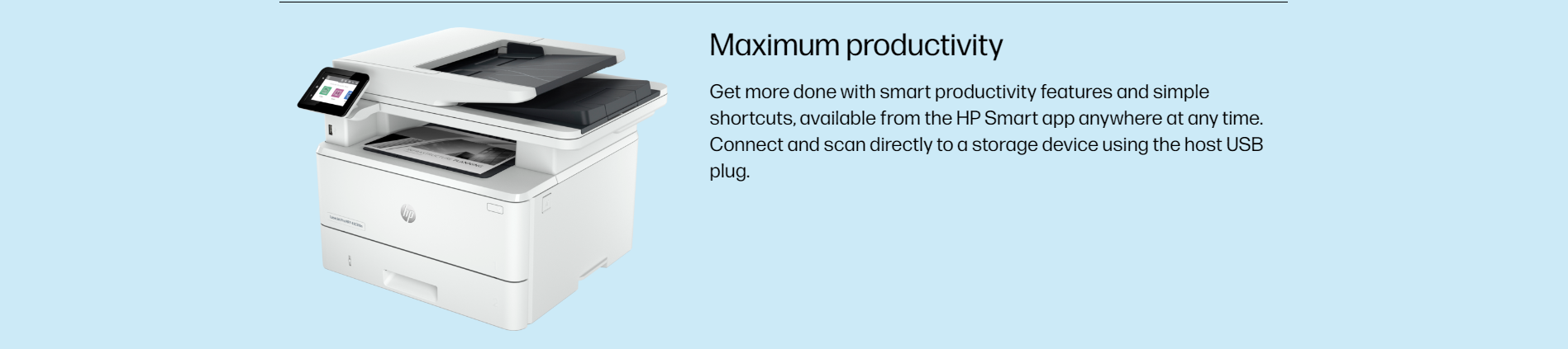 • Robust connectivity – Includes Gigabit Ethernet, USB ports, and mobile printing via AirPrint, Mopria, and HP Smart.
