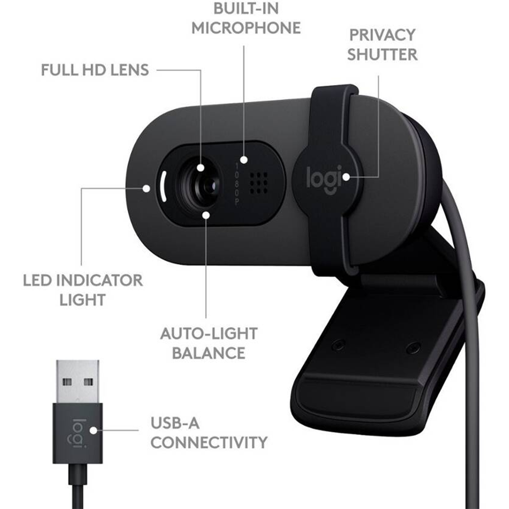 Logitech Brio 100 Full HD Webcam for Meetings and Streaming, Auto-Light Balance, Built-In Mic, Privacy Shutter, USB-A, for Microsoft Teams, Google Meet, Zoom and More – Graphite